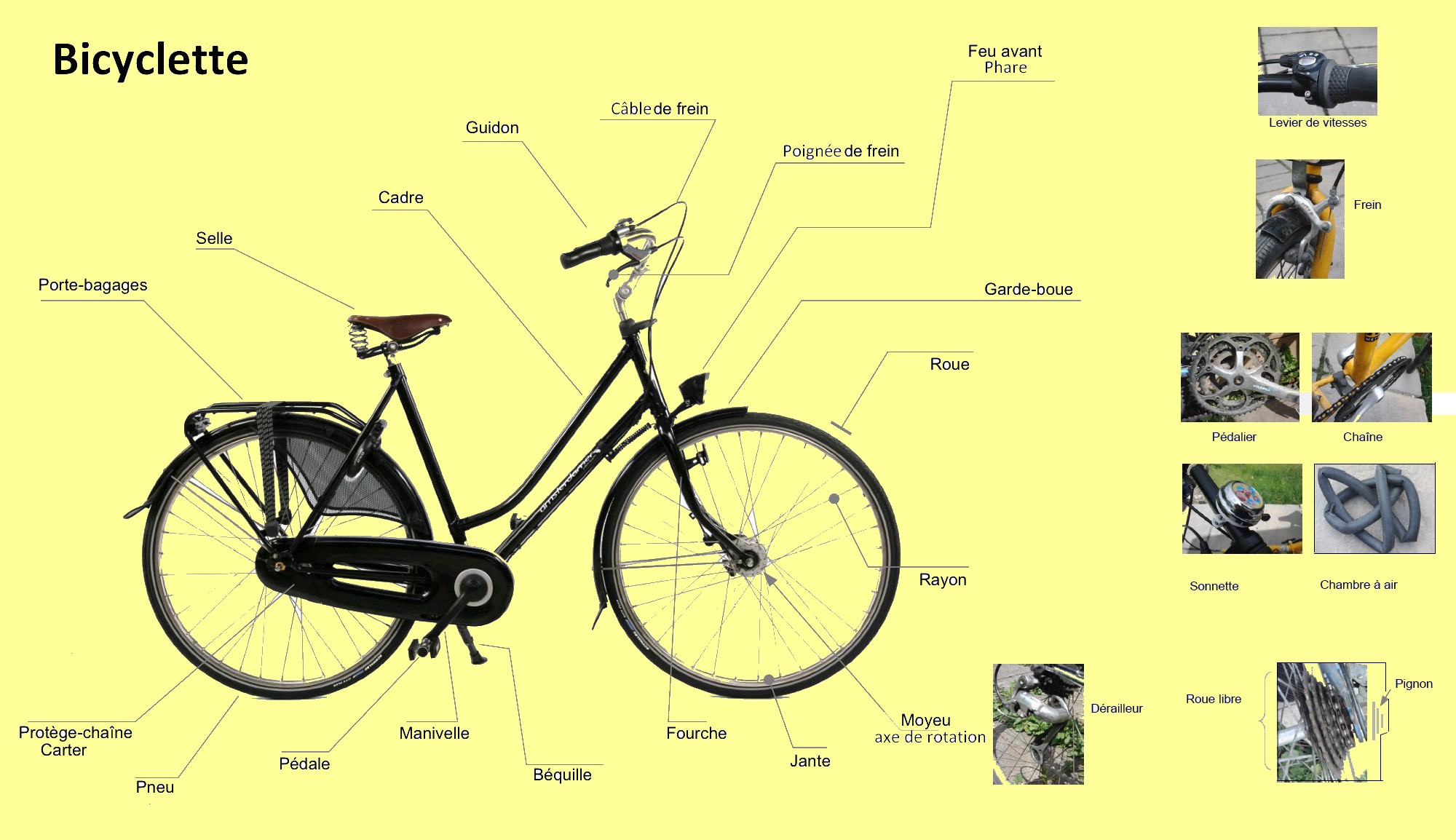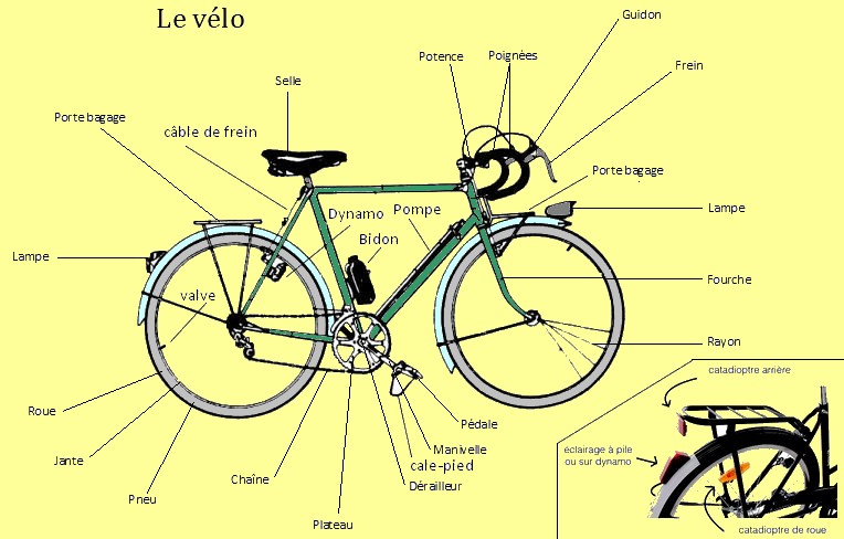 On prendra le temps d'évoquer les éléments constituants du vélo, ou bicyclette, en évoquant particulièrement les dispositifs de sécurité et on se familiarisera avec le vocabulaire spécifique. On pourra imprimer sur papier les images légendées de cette page pour un travail personnel puis, ultérieurement proposer de remplir les images vierges pour vérifier que le vocabulaire est acquis en sens autant qu'en orthographe.