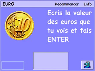"Je compte mes p'tits euros" permet de travailler sur la reconnaissance des billets et pièces en Euro. Les images sont très ressemblantes et les exercices sont adaptés